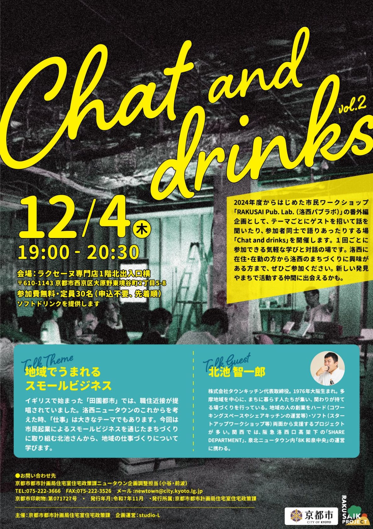 京都市では、市民ワークショップ「RAKUSAI Pub.Lab.(洛西パブラボ)」により、暮らしを豊かにするまちづくりを進めており、まちづくり活動の更なる活性化に向け、テーマごとにゲストを招いて話を聞き参加者同士で語り合う場「Chat and drinks」を開催しています。その第2回目である「地域でうまれるスモールビジネス」をテーマにしたトークイベントに北池が登壇します。
